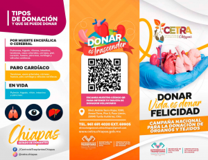Material de difusión Todo material informativo que figura en esta página está disponible a quien desee informarse sobre el tema de la donación de órganos y el trasplante.Son materiales realizados por CETRA CHIAPAS en el marco de la Campaña de Donación y Trasplante de Órganos y Tejidos.